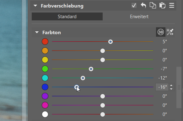 Wie wählt man die richtigen Farbverschiebungen aus? Es gibt keine allgemeingültige Regel. Verschieben Sie die Farbtöne nur leicht und achten Sie auf den Gesamteindruck. Konzentrieren Sie sich vor allem auf Grün, Blau und Rot.