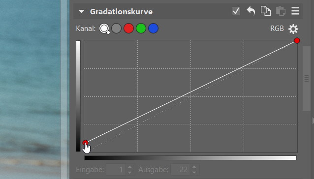 Das Ziel ist es nicht, ein flaches Bild zu erstellen, sondern die Übergänge zwischen Licht und Schatten zu mildern. Das Foto sollte schon auf den ersten Blick weicher wirken. Eine große Hilfe ist auch die Kurve – ein leichtes Anheben des Schwarzpunkts verleiht dem Bild einen typischen verblassten Film-Look.