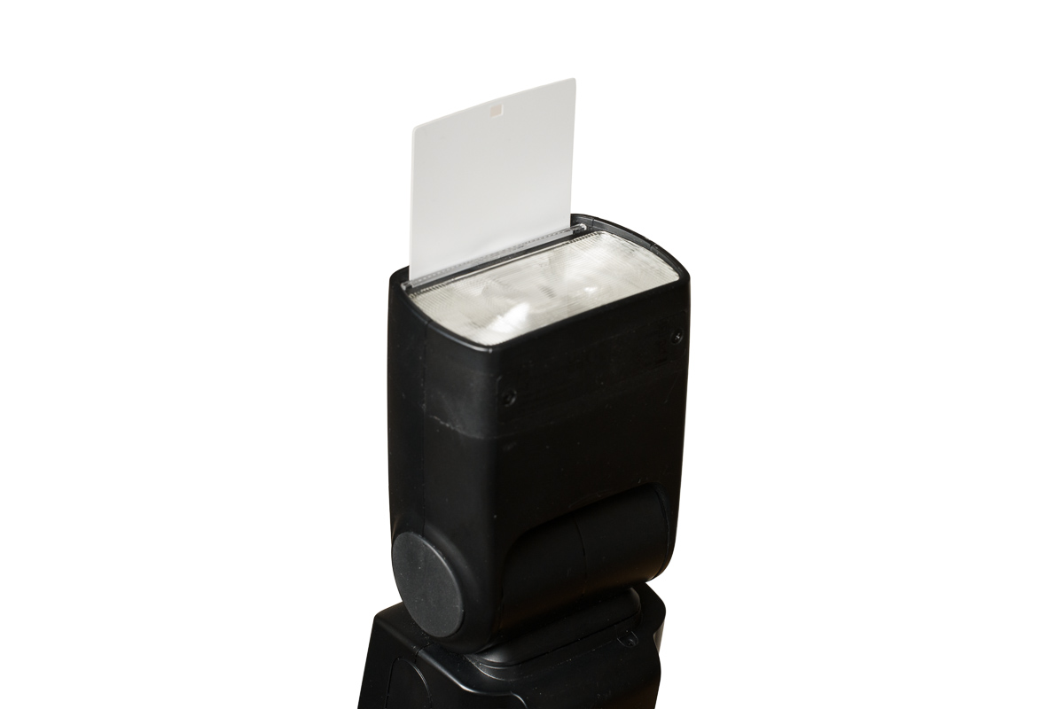 Reflexion von der Decke hat jedoch einen kleinen Nachteil: Die Unterseite des Gesichts wird verschattet und außerdem fehlt oft der „Glanz” in den Augen. Beides lässt sich mit einer ausziehbaren Platte, der sogenannten Weißkarte am oberen Ende des Blitzes beheben, die einen Teil des Lichts nach vorne umleitet.