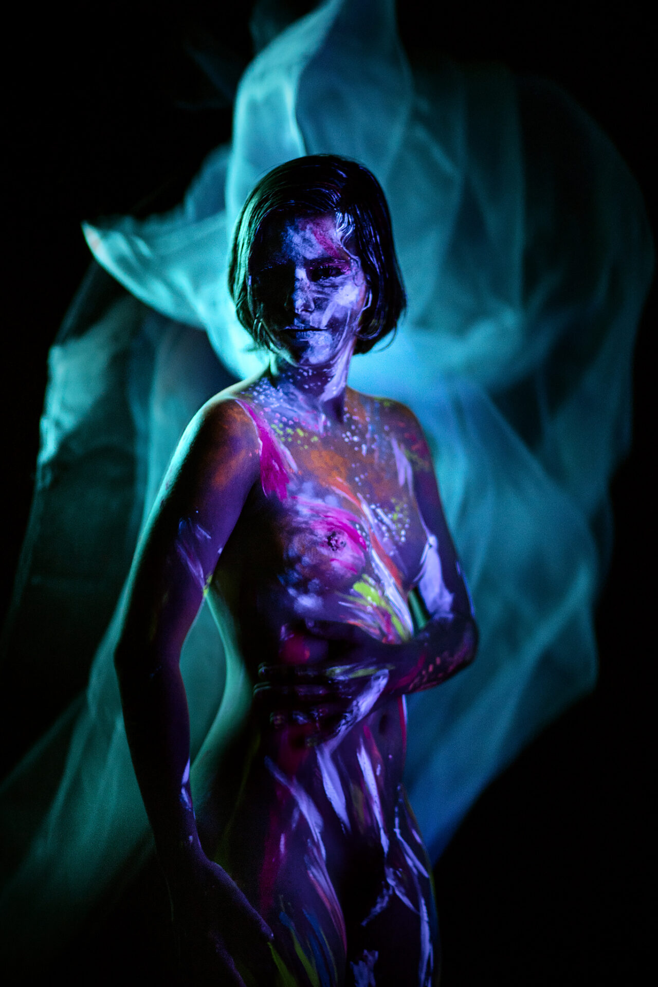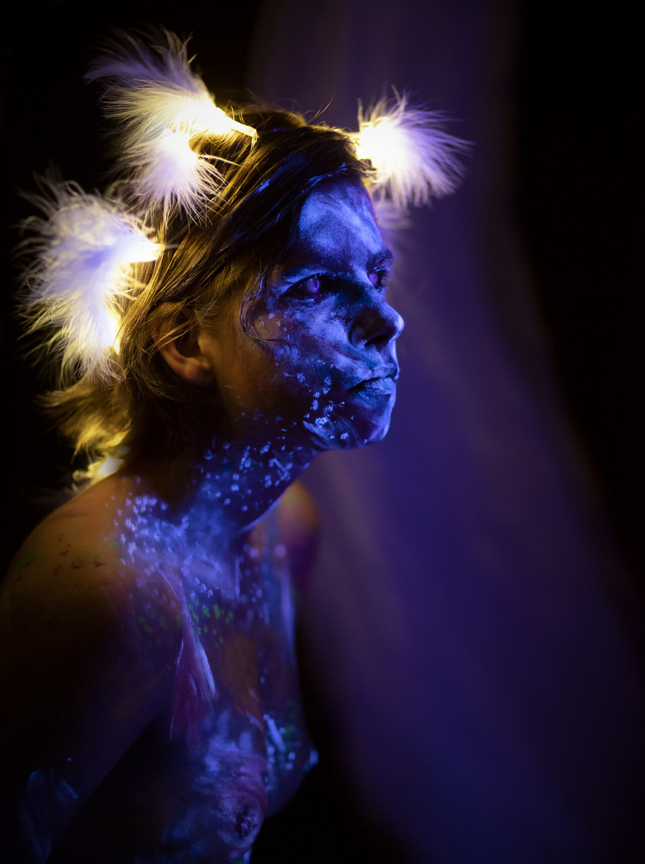 Ist es sinnvoll, UV-Licht beim Fotografieren mit einer zusätzlichen Beleuchtung zu kombinieren? Ja. Der UV-Effekt ist zwar deutlich, aber manchmal muss das Gesicht mit klassischem Licht „modelliert“ werden, damit das Porträt nicht flach wirkt.