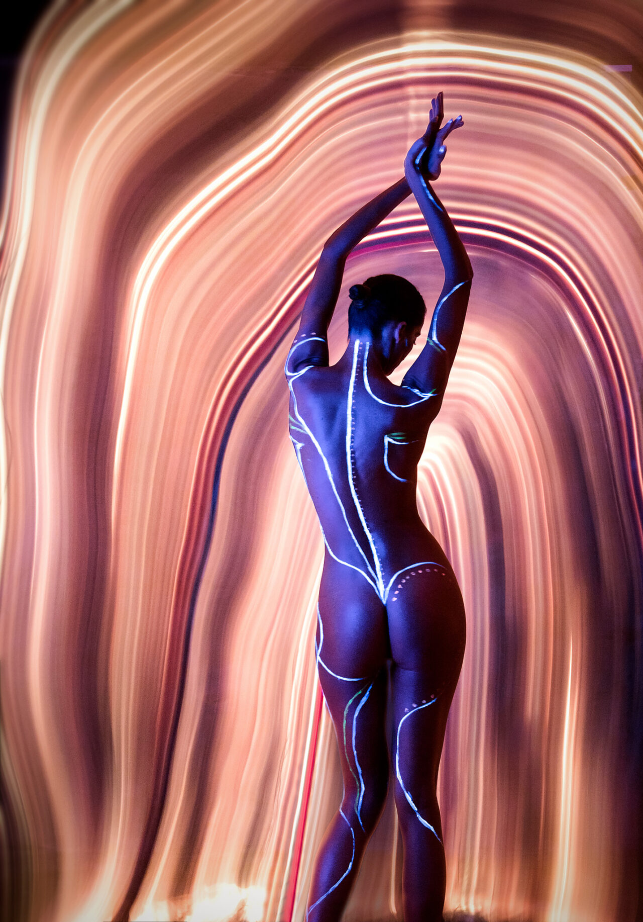 Die zweite Variante der Nachbeleuchtung ist Dauerlicht und eine längere Belichtungszeit. Da ich mich auf das Malen mit Licht konzentriere, probiere ich in erster Linie diese Kombination aus. Sie ist jedoch für das Model anspruchsvoller: Es muss mehrere Sekunden lang ohne die geringste Bewegung stillhalten.
