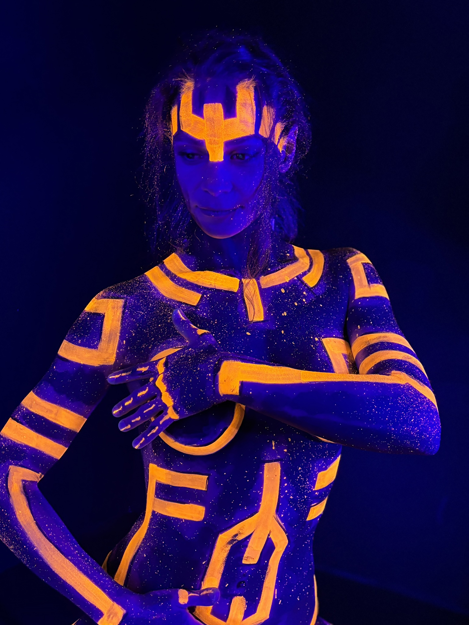 Es gibt eine ganze Reihe von Objekten, die ultraviolette Strahlung reflektieren und darin leuchten. Das können weiße Kleidung oder spezielle Artikel sein, die Sie in Partygeschäften finden: Perücken, Masken, Kontaktlinsen, UV-aktive Farbpulver oder spezielle Farben. Der Vorteil von Farben besteht darin, dass sie genau das hervorheben, worauf Sie die Aufmerksamkeit lenken möchten. Das kann auffälliges Make-up sein (auf dem Foto sind die geschminkten Gesichtspartien zu sehen) oder Bodypainting.