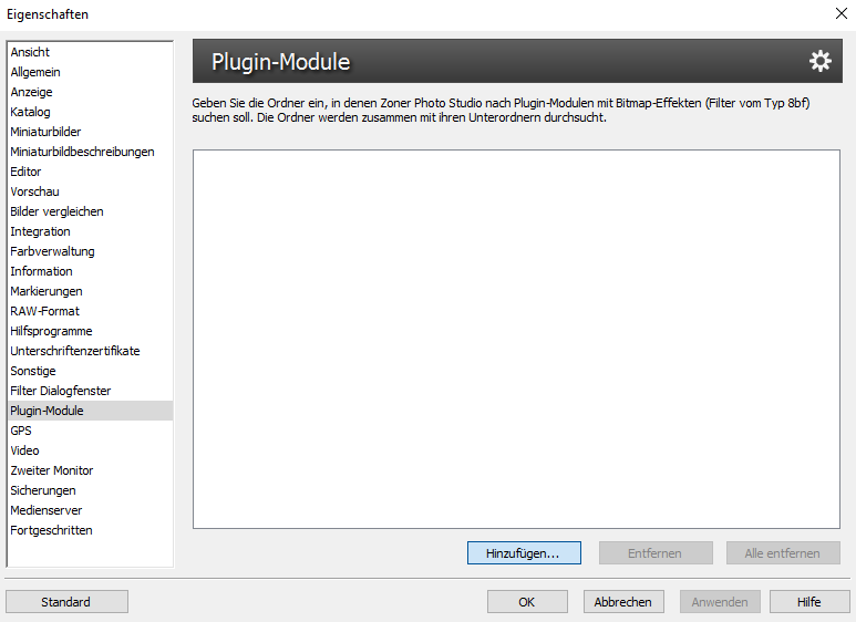 In beiden Fällen erhalten sie das gleiche Dialogfenster. In diesem wählen Sie dann den Ordner, auf welchem Zoner Studio auf die Plug-Ins zugreifen soll. Mithilfe des Buttons Hinzufügen, können Sie weitere Plug-Ins hinzufügen.