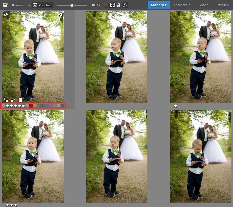 Die Mehrfachauswahl finden Sie in Zoner Studio in drei Modulen: Manager, Entwickeln und Erstellen. Sie müssen nur den Ansichtsmodus Vorschau aktiviert haben. Sie haben hierbei zwei Möglichkeiten, wie Sie das beste Bild auswählen.