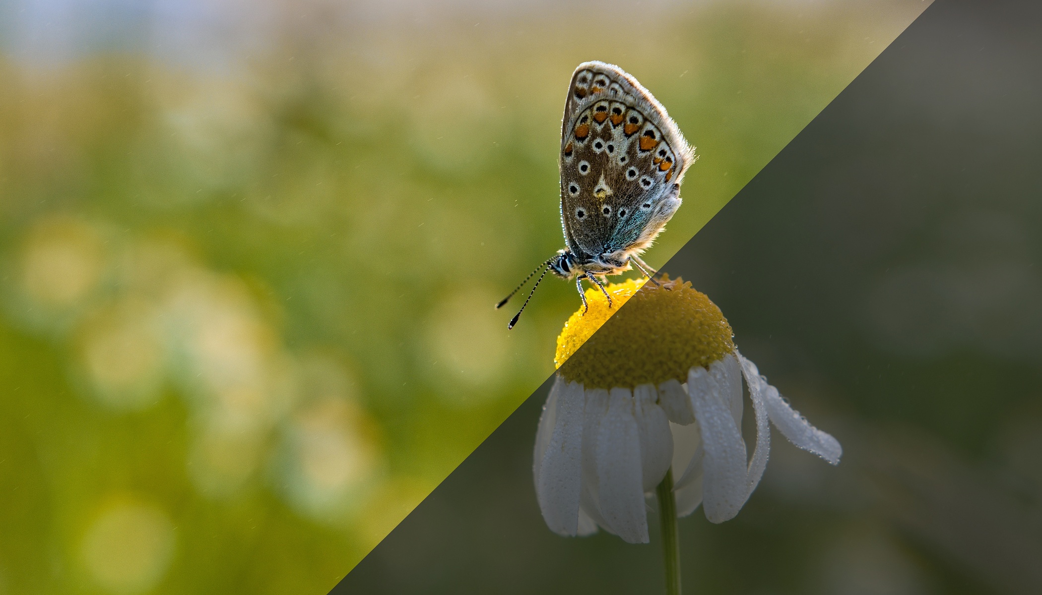 Oft ist es auch sinnvoll, einen bestimmten Teil des Fotos separat zu bearbeiten. Dank AI-Masken ist dies mit nur wenigen Klicks möglich. Wir möchten den Hintergrund des Fotos abdunkeln, damit der Schmetterling und die Blume besser zur Geltung kommen. Dazu klicken wir im rechten Bereich Entwickeln auf Lokale Anpassungen (L) und wählen die AI-Maske Hintergrund aus.
