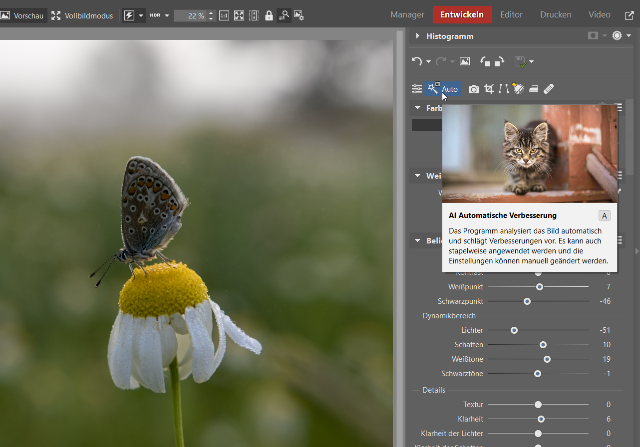 Was tun, wenn ich mit den Einstellungen nicht zurechtkomme? Es empfiehlt sich, mit der Funktion Automatische Verbesserung (A) zu beginnen, die das Bild mithilfe von KI optimiert. Anschließend können Sie die Details nach Ihrem Geschmack manuell anpassen.