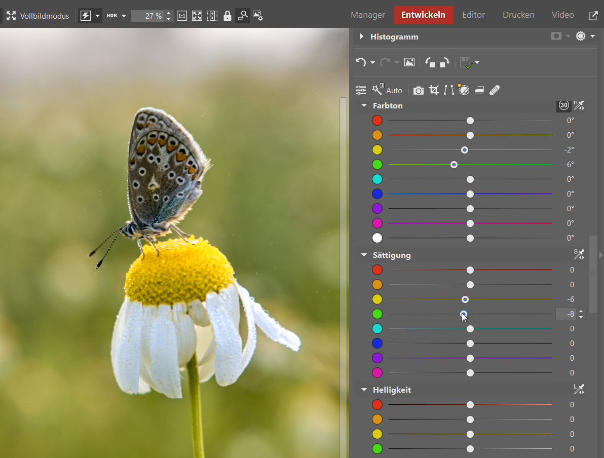 Manchmal ist auch eine Farbverschiebung der einzelnen Farben sinnvoll. In diesem Fall haben wir Gelb und Grün in Richtung wärmerer Farbtöne verschoben und ihre Sättigung reduziert, da sie zu kräftig waren.
