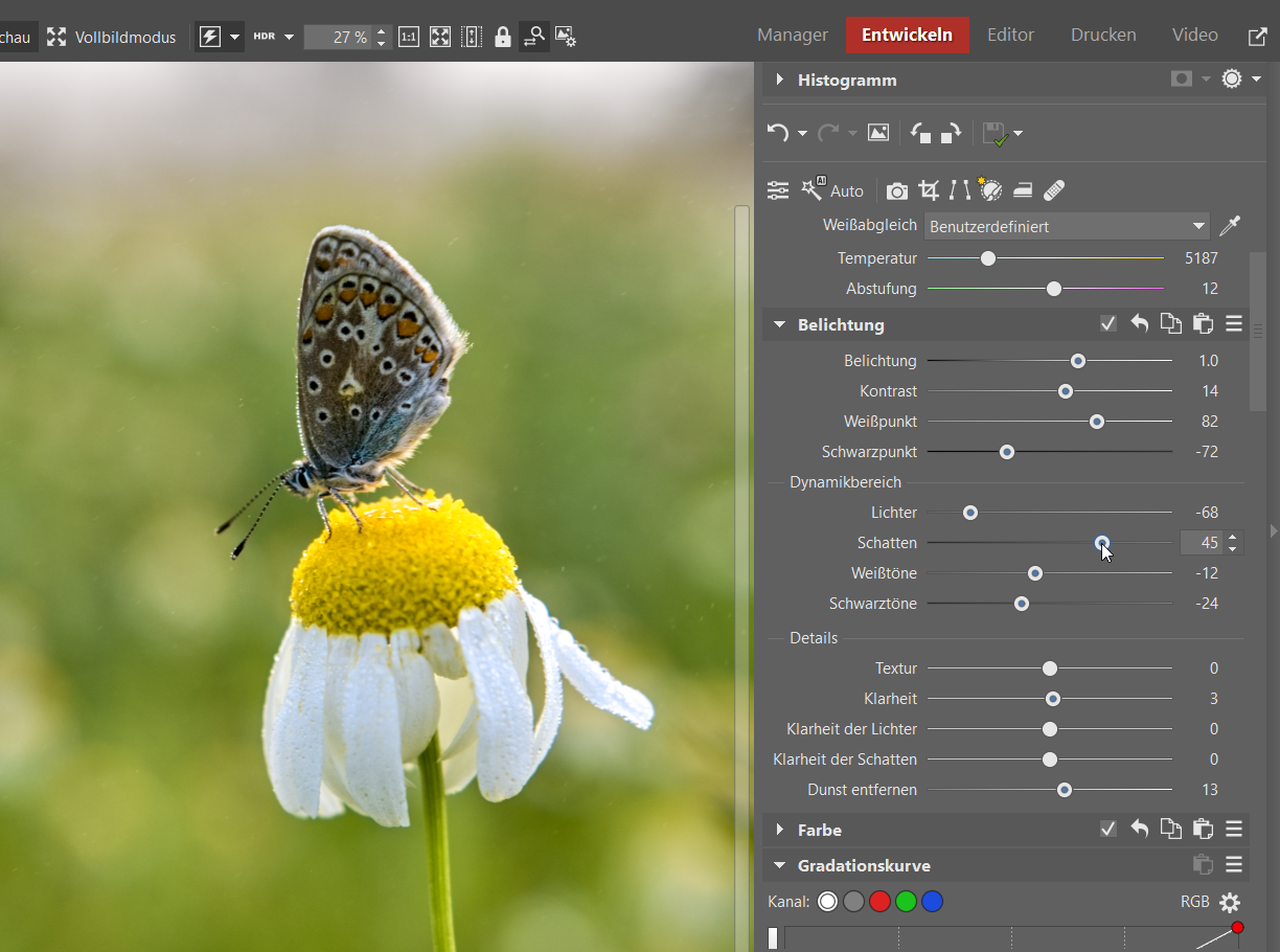 Damit ist die Arbeit jedoch noch nicht beendet, denn das Ergebnis ist noch nicht ganz zufriedenstellend und wir möchten das Foto nach unserem Geschmack bearbeiten. Wir nehmen also noch einige Feinabstimmungen an den Belichtungswerkzeugen vor. In diesem Fall müssen vor allem die Schieberegler in den Bereichen Belichtung und Dynamikumfang angepasst werden. Neben einer Aufhellung des Bildes erzielen wir dadurch auch einen höheren Kontrast.