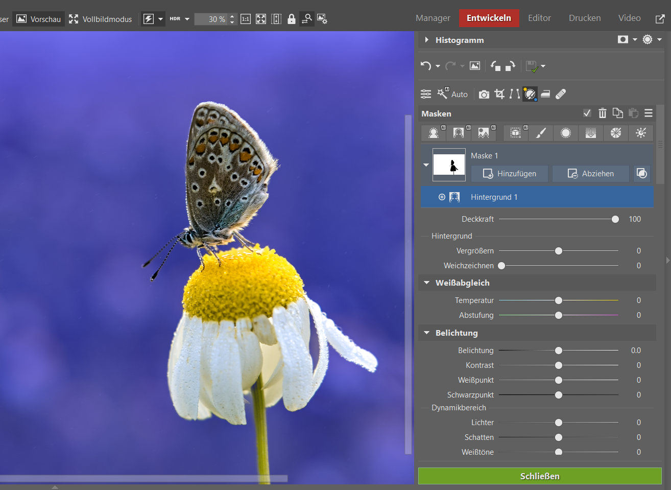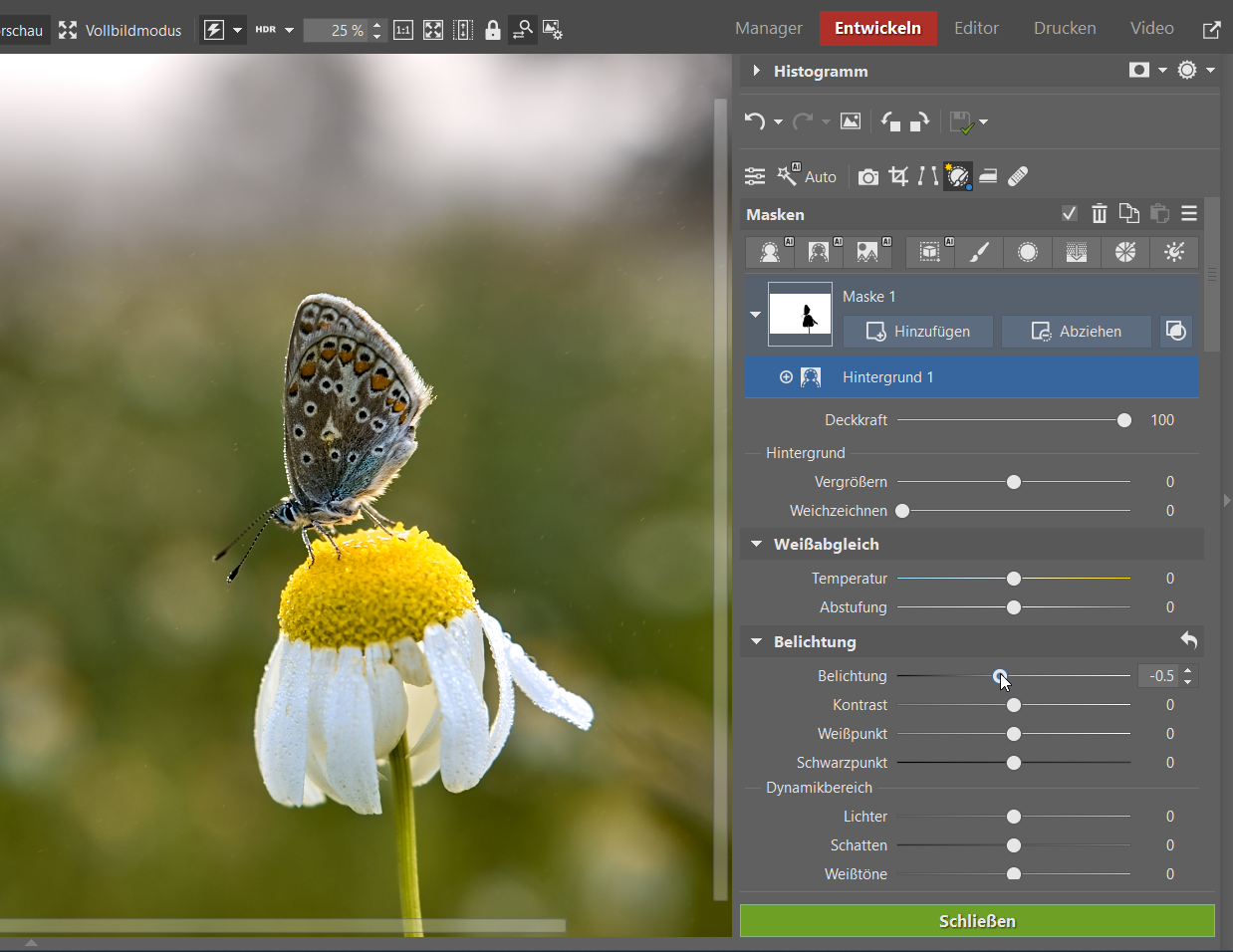Oft ist es auch sinnvoll, einen bestimmten Teil des Fotos separat zu bearbeiten. Dank AI-Masken ist dies mit nur wenigen Klicks möglich. Wir möchten den Hintergrund des Fotos abdunkeln, damit der Schmetterling und die Blume besser zur Geltung kommen. Dazu klicken wir im rechten Bereich Entwickeln auf Lokale Anpassungen (L) und wählen die AI-Maske Hintergrund aus.