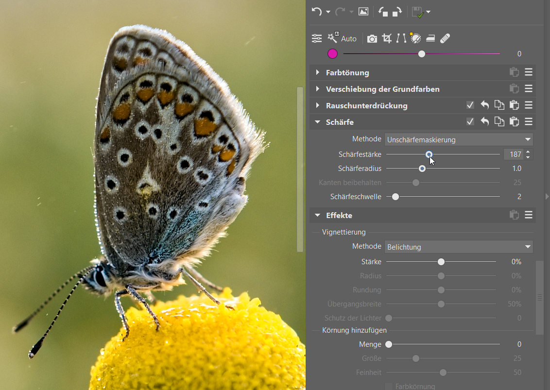 Eine leichte Rauschunterdrückung und Schärfung sind immer sinnvoll. Vergrößern Sie das Foto bei diesen Bearbeitungen immer auf 100 %, damit Sie die Intensität richtig einschätzen können. Bei unserem Foto hatten wir kein Problem mit Rauschen, daher reichte eine leichte Schärfung aus.