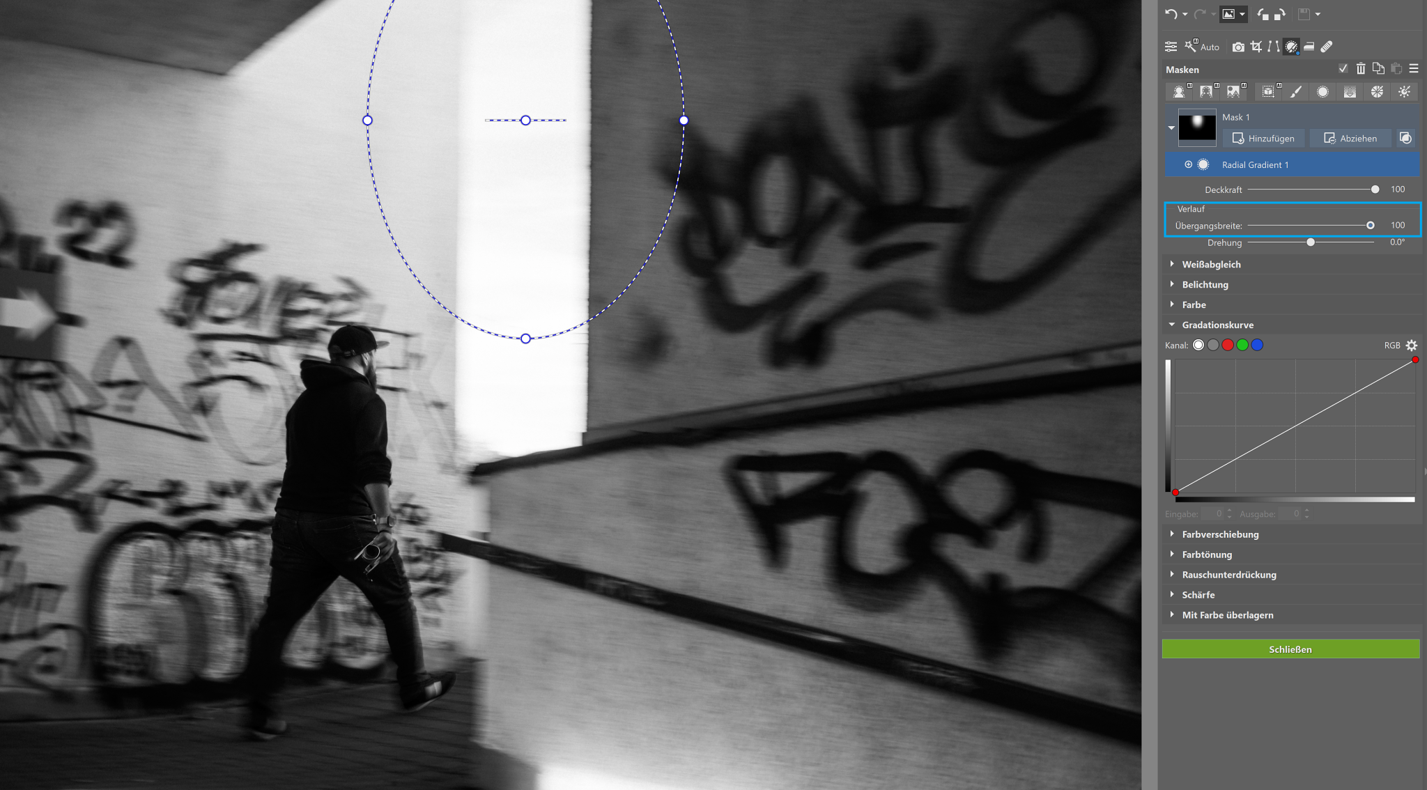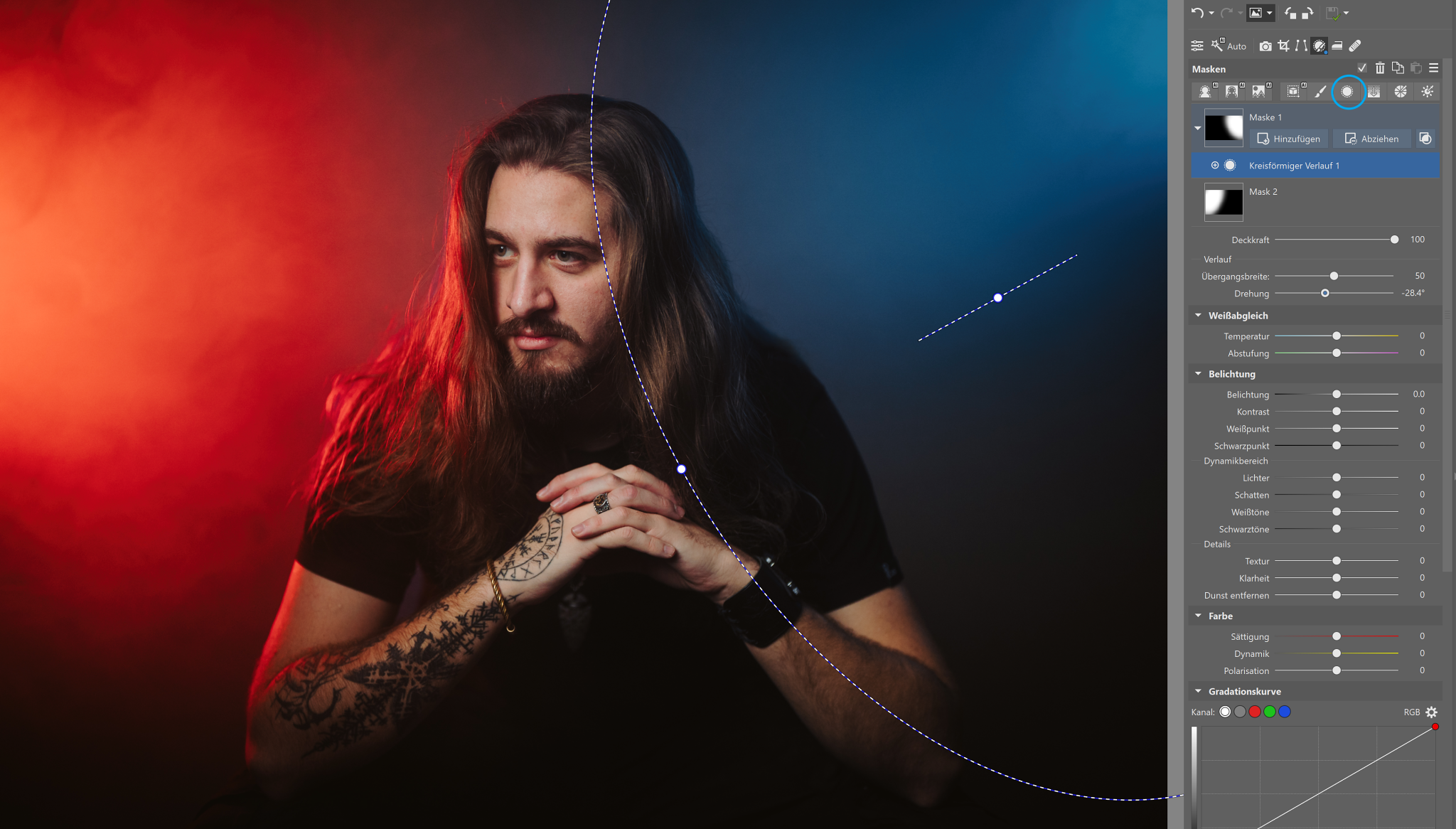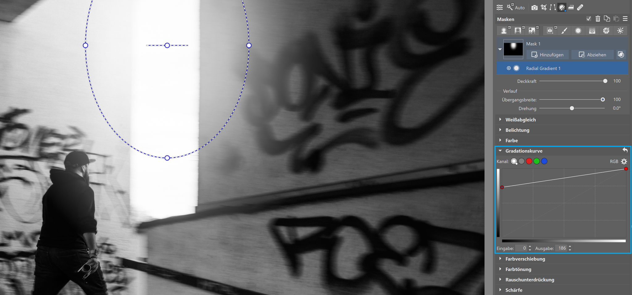 Ist es sinnvoll, den kreisförmigen Verlauf auch für Porträts zu verwenden? Ja, insbesondere bei der Bearbeitung von Farben, Licht oder der sanften Hervorhebung des Gesichts. Der Vorteil besteht darin, dass die Hautfarben außerhalb des ausgewählten Bereichs nicht beeinflusst werden.