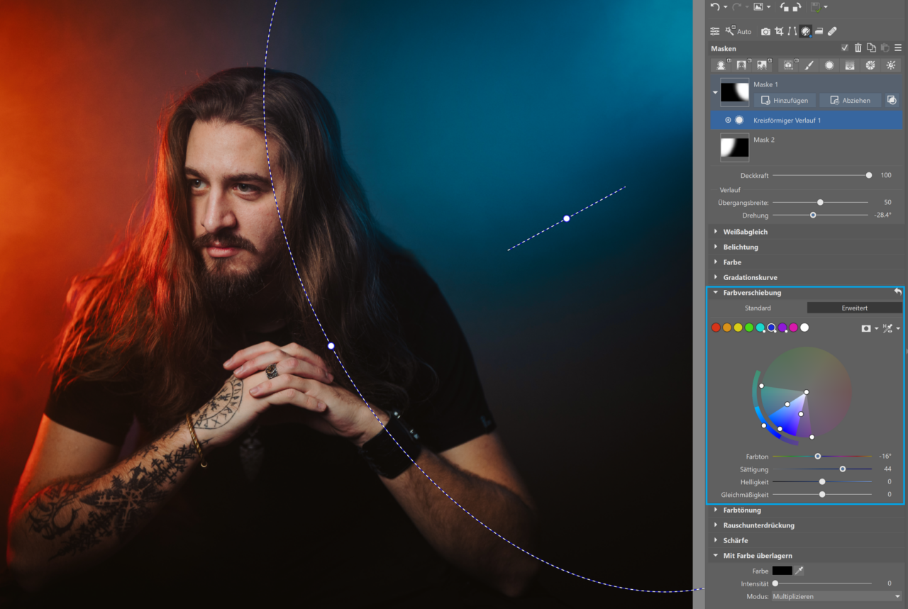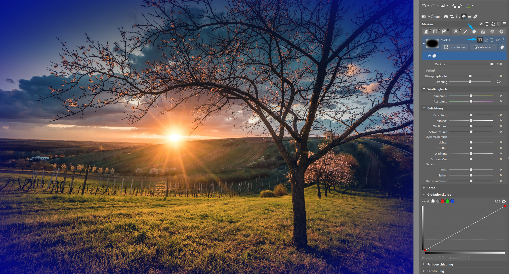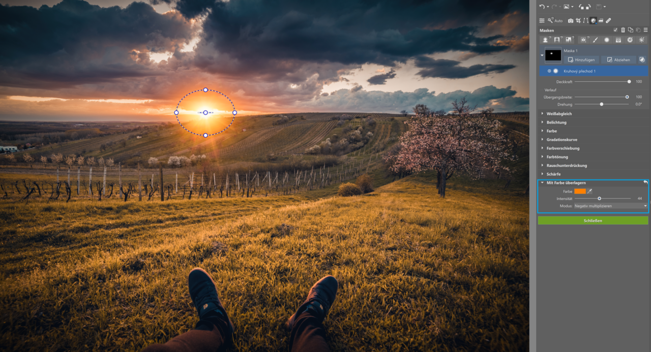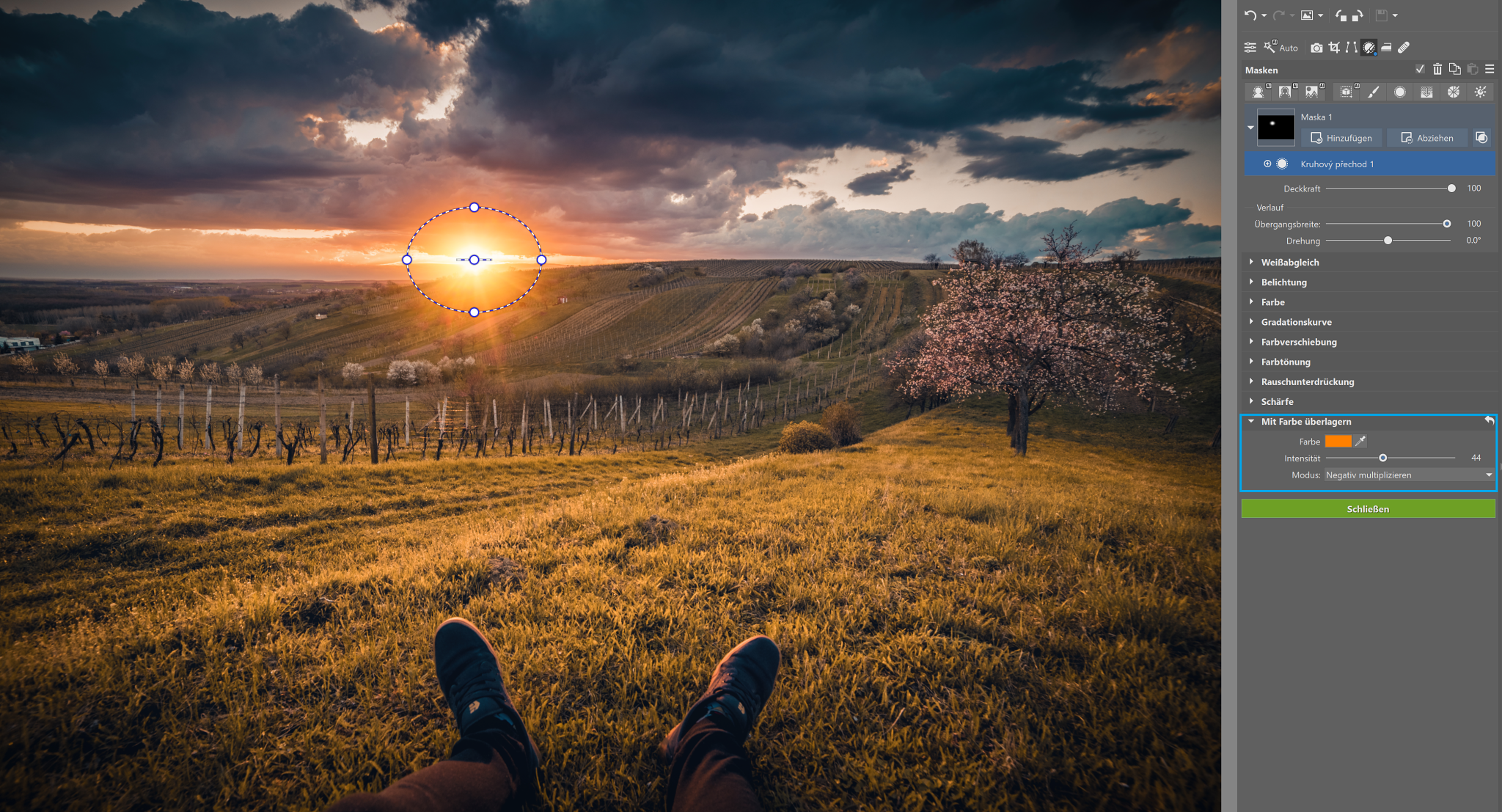 Markieren Sie diesmal mit dem kreisförmigen Verlauf nur die Sonne und ihre Umgebung. Geben Sie im Abschnitt Farbe einen Orangeton ein, den die Sonne haben könnte. Stellen Sie eine angemessene Intensität ein (im Bild unten sind es beispielsweise etwa 40). Wechseln Sie in den Modus Negativ multiplizieren und stellen Sie die Übergangsbreite auf das Maximum ein, damit der Effekt so fließend wie möglich ist.