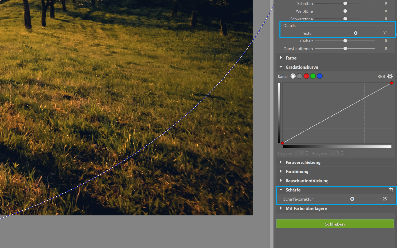 Die genauen Parameter beider Werkzeuge hängen davon ab, wie stark Sie die Bildränder schärfen möchten. Beachten Sie jedoch, dass Sie es wie bei anderen Bearbeitungen auch mit der Nachschärfung nicht übertreiben dürfen. Andernfalls wirkt das Bild unnatürlich.